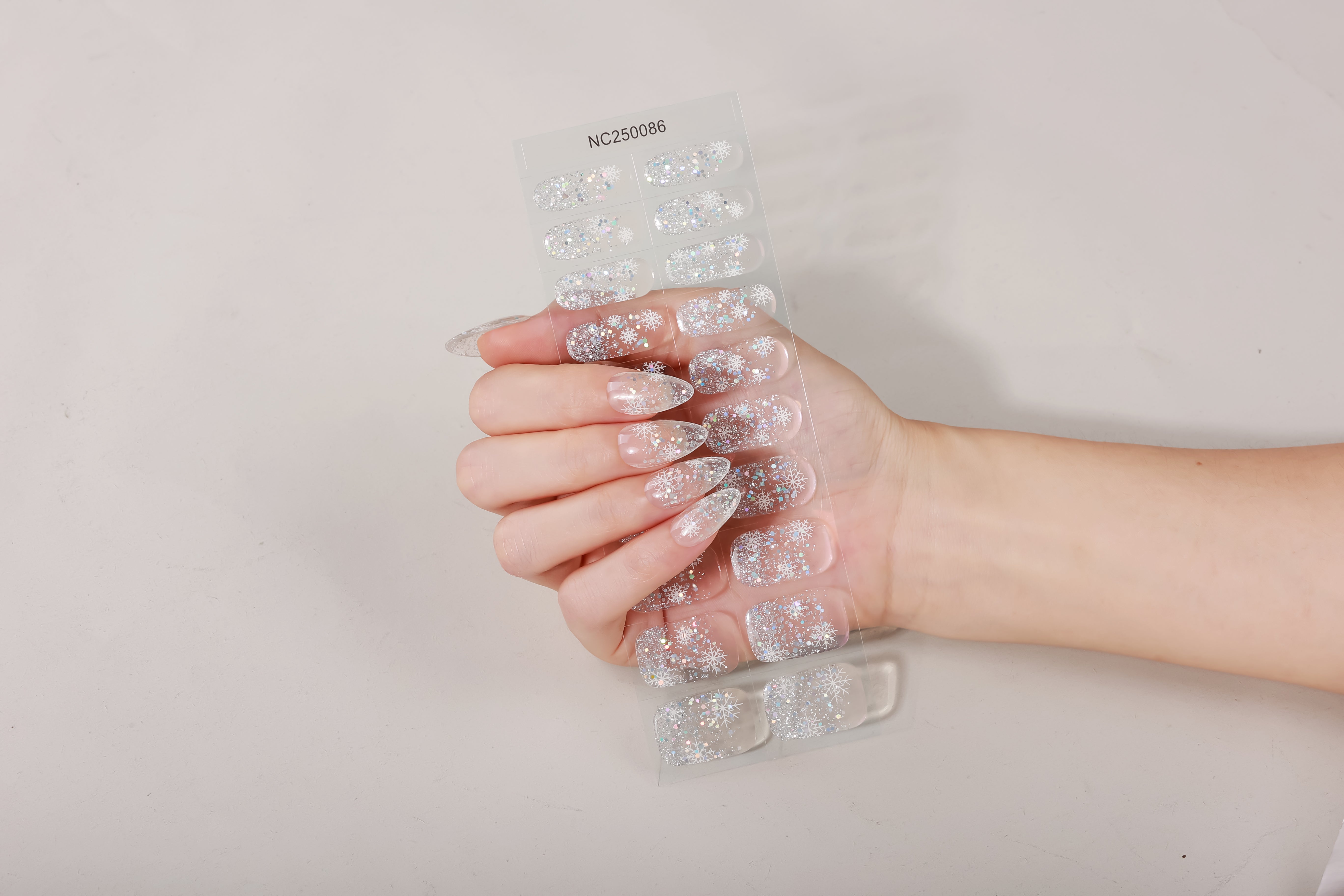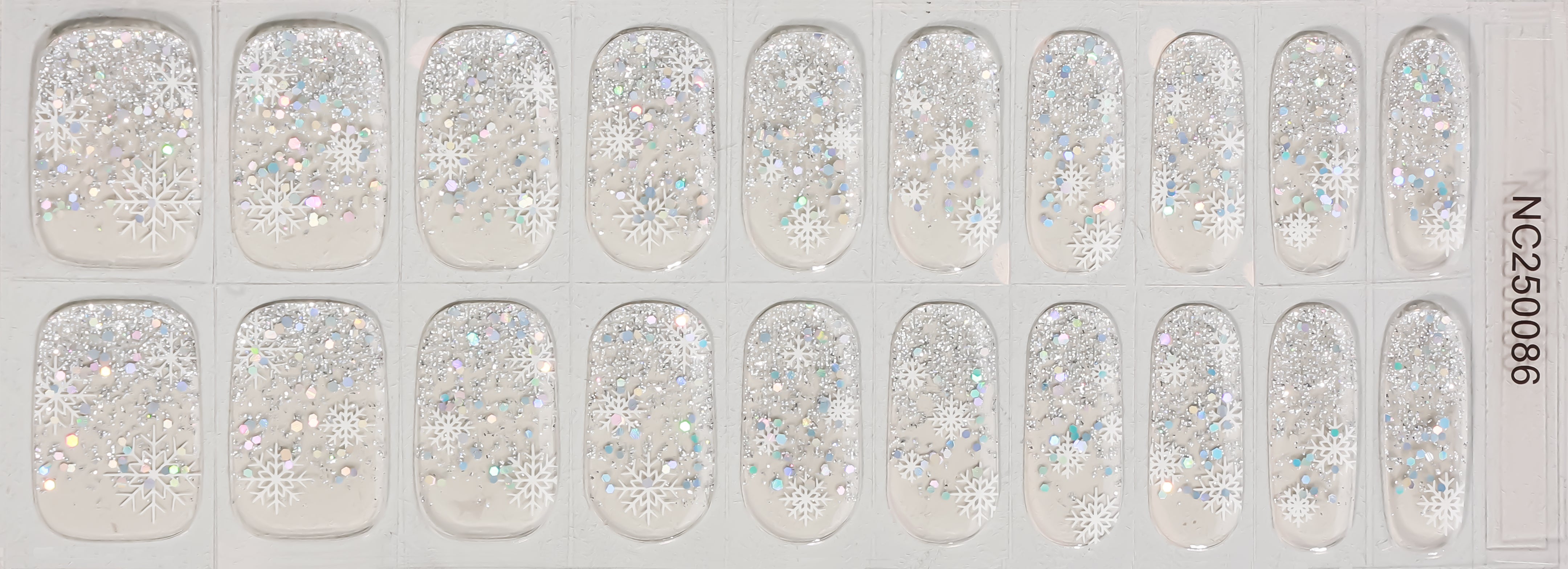 An enchanting winter glaze combining holographic shines and snowy motifs, ideal for cozy nights and holiday celebrations.