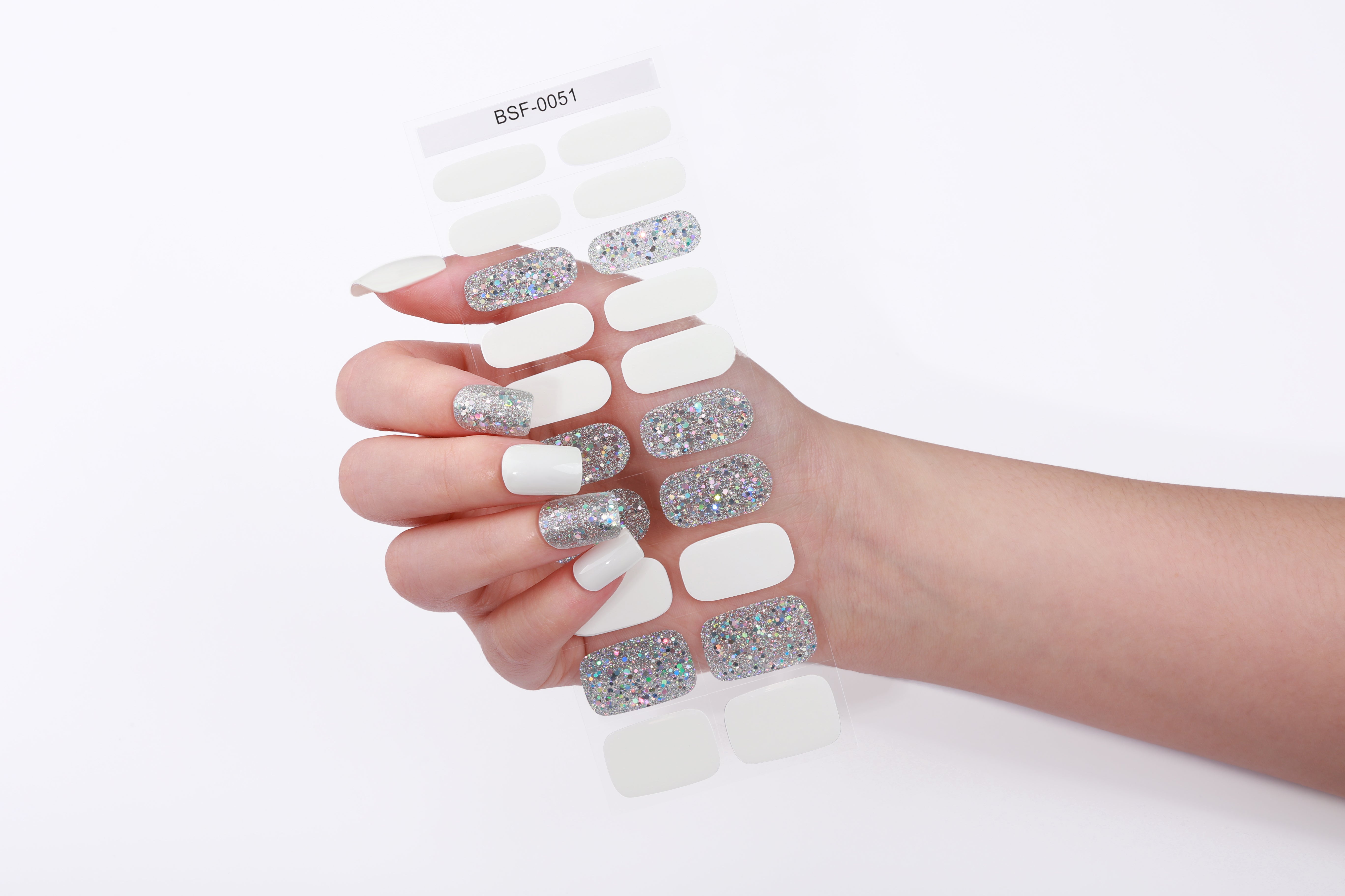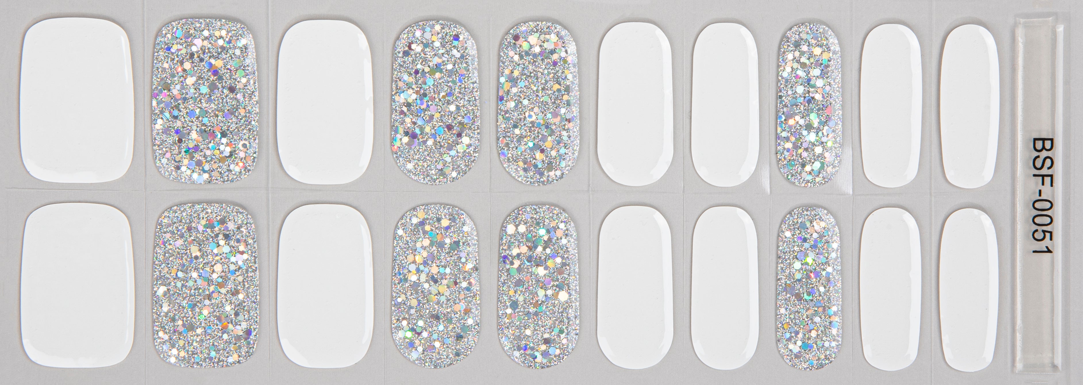 The white nails give a clean, minimal, and polished look, while the glitter pieces add a spectacular multidimensional shine—reflecting rainbow sparkles under any light.