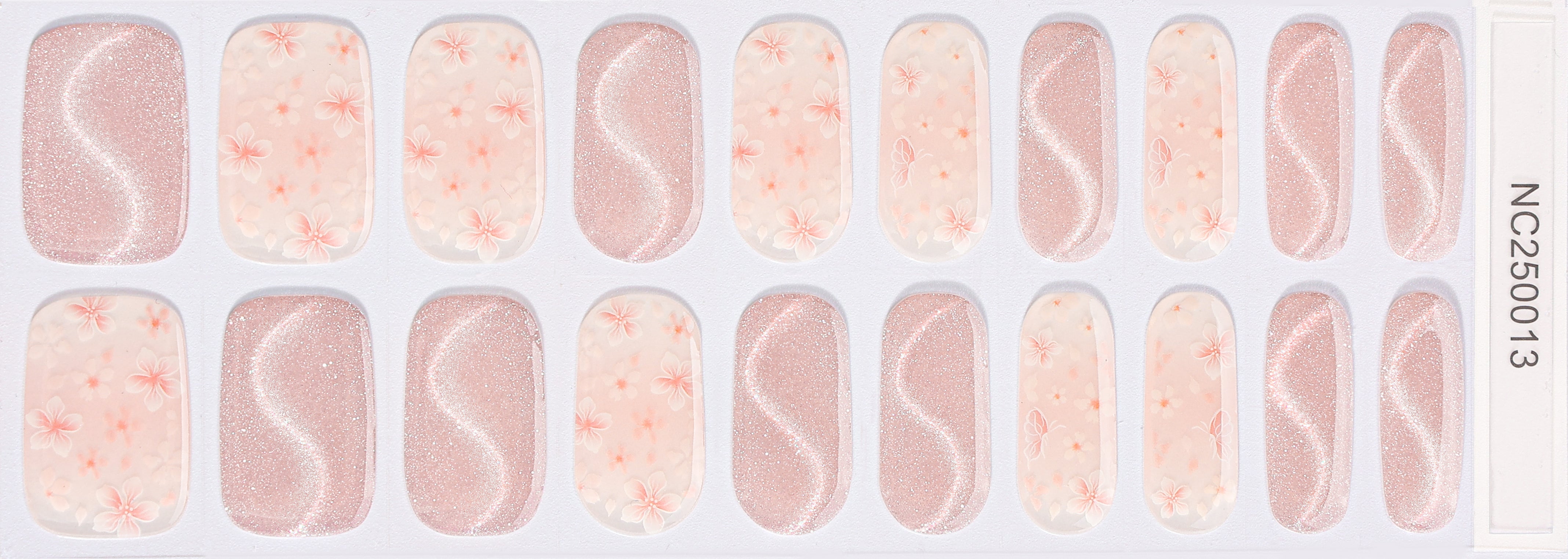 A soft peachy-nude base adorned with delicate blossom petals and paired with champagne shimmer for a gentle, romantic glow.