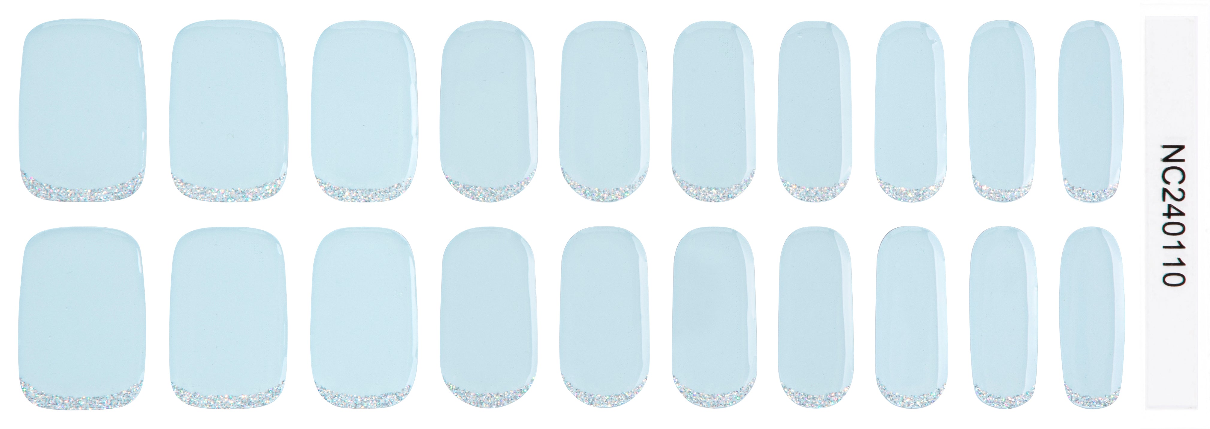A soft, dreamy pastel ice-blue that feels cool, clean, and effortlessly elegant. Each nail is finished with a delicate crystal glitter tip, adding a frosty shimmer that catches the light like fresh winter snow.