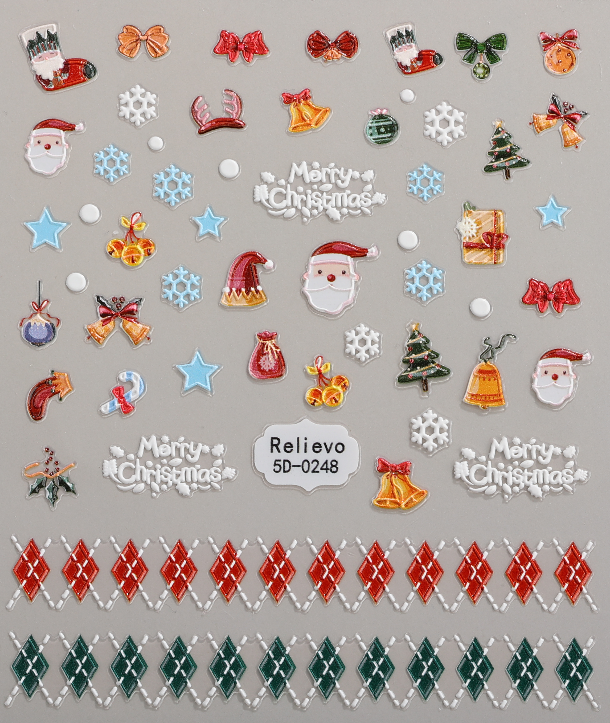 Santa faces, Christmas trees, winter snowflakes, holiday bells, bows, stockings & ornaments
