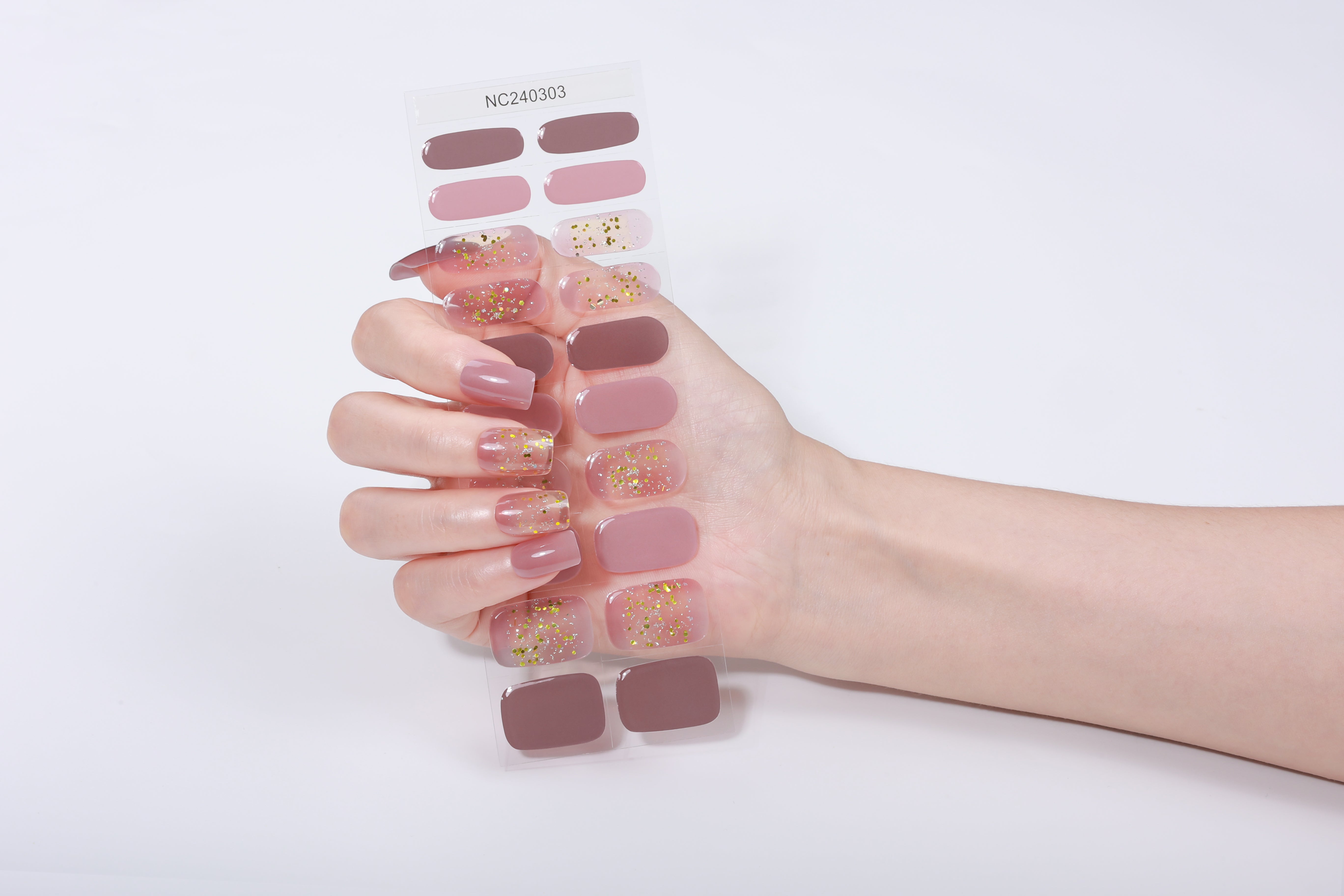 A pink-to-ivory gradient topped with golden reflective glitters—playful, pretty, and uniquely textured.