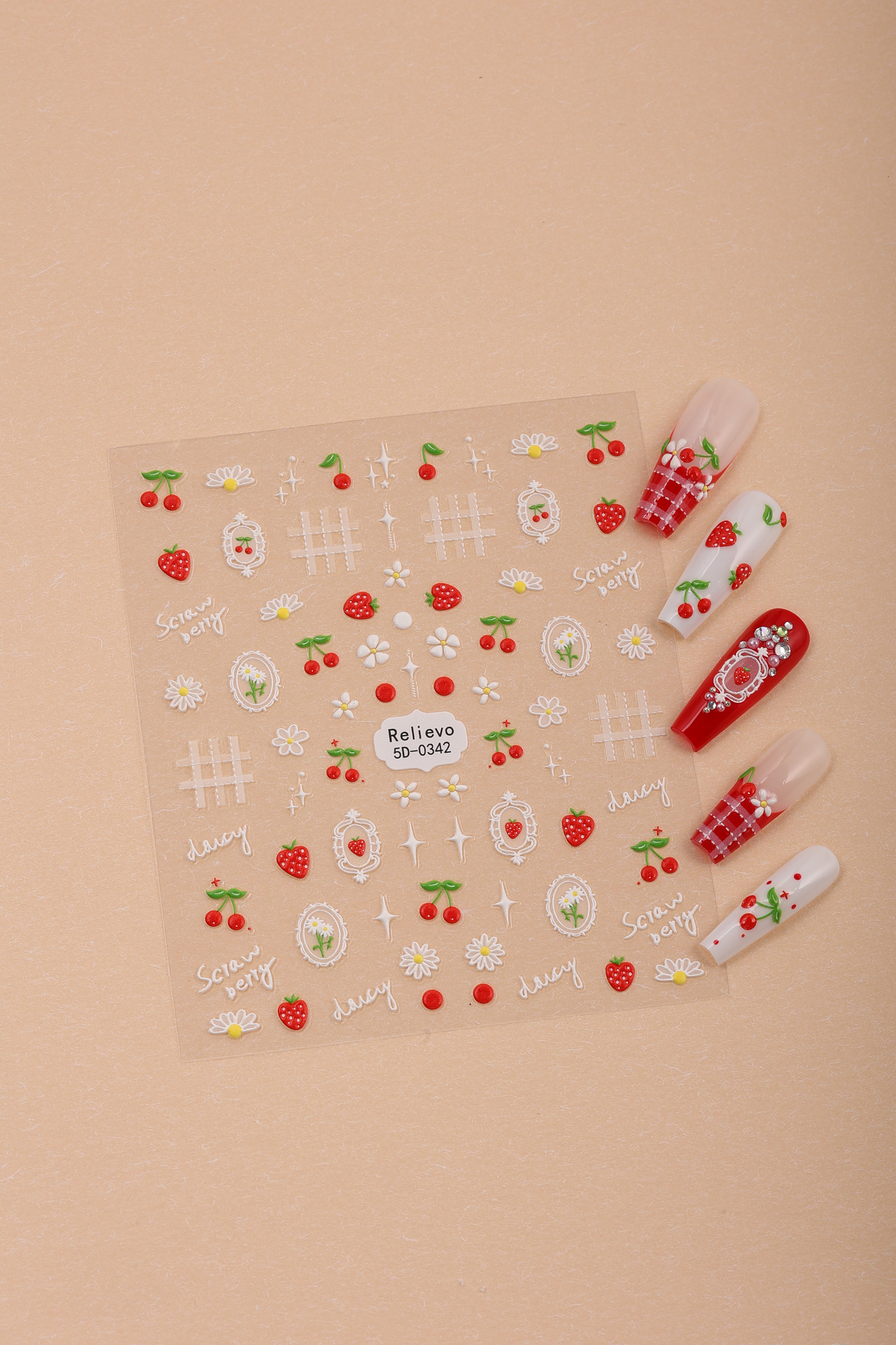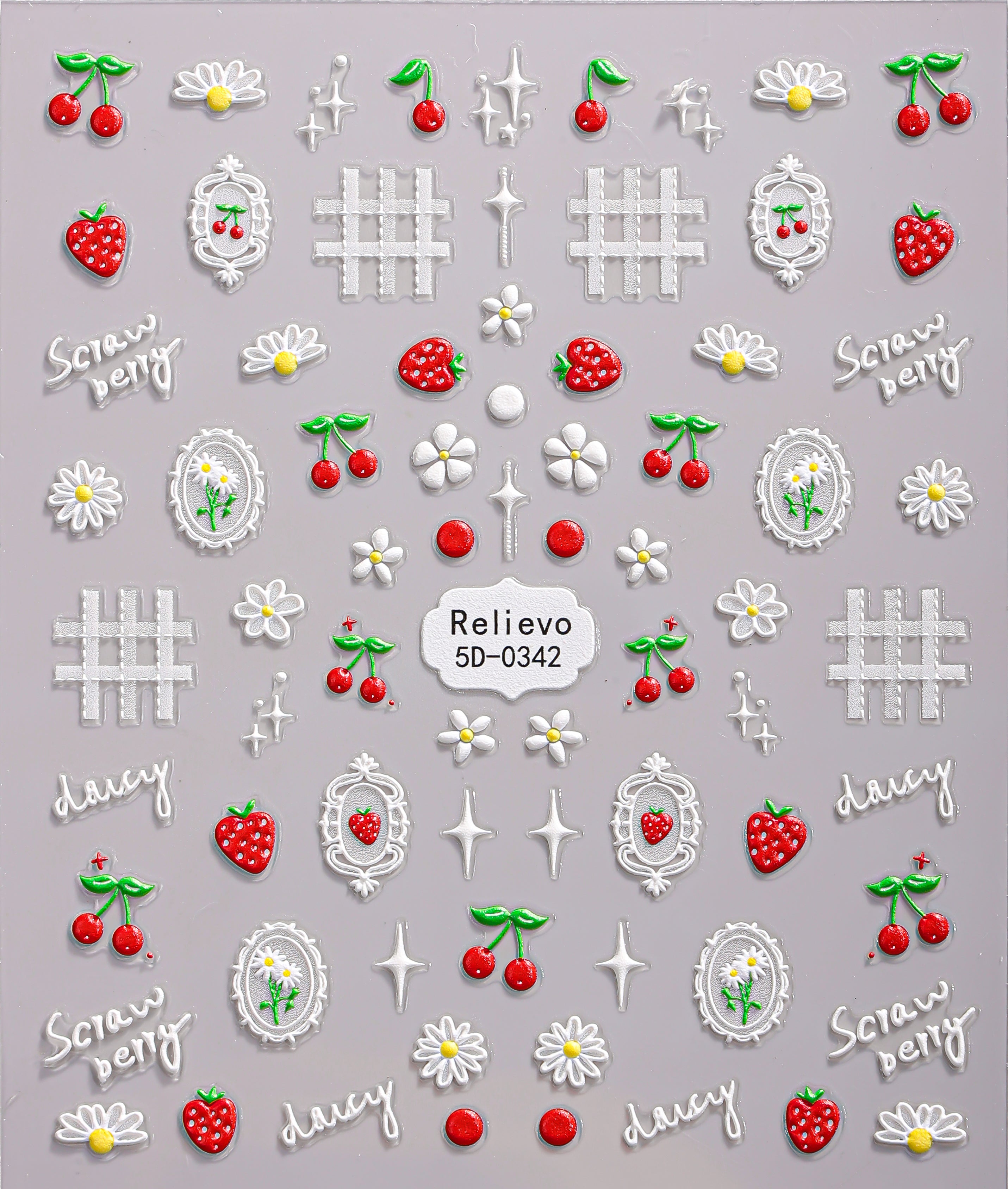 A sweet blend of strawberries, cherries, daisies, and soft white lattice accents. Perfect for fresh, cute picnic-inspired nails with a soft coquette vibe.
