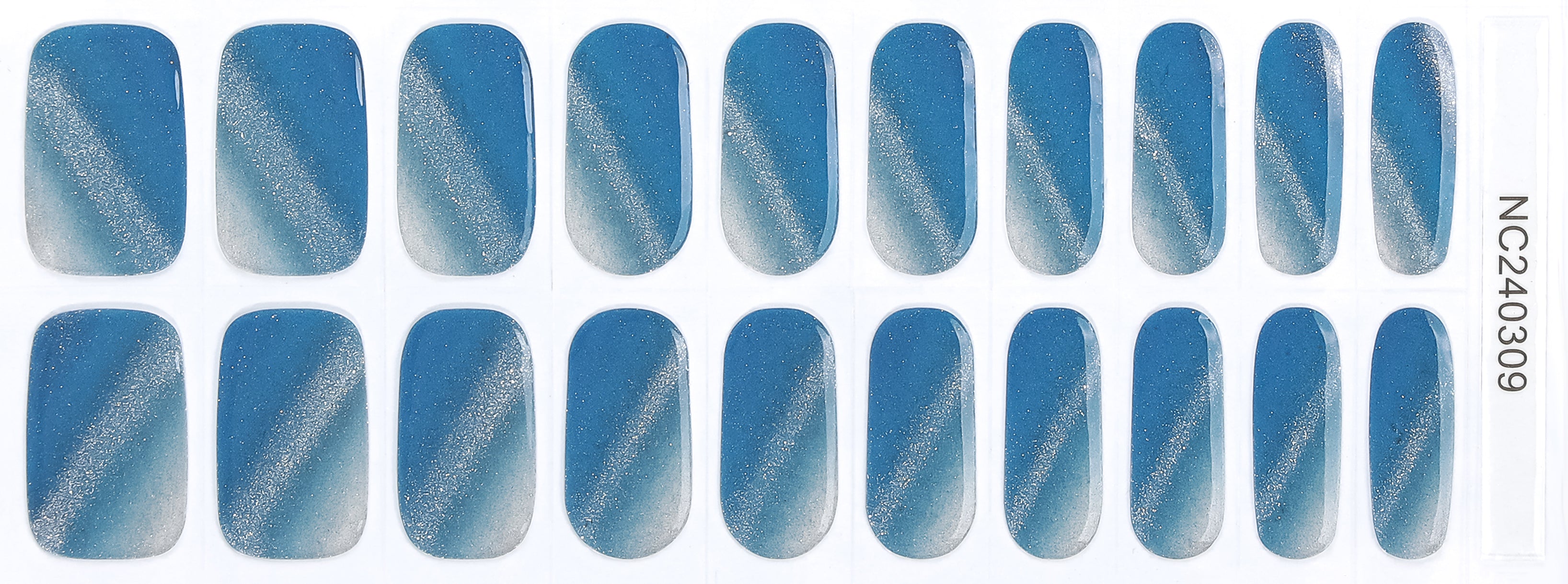 A deep ocean-blue base that softly fades into a misty shore. Fine silver sparkle sweeps diagonally like sunlight dancing across waves.