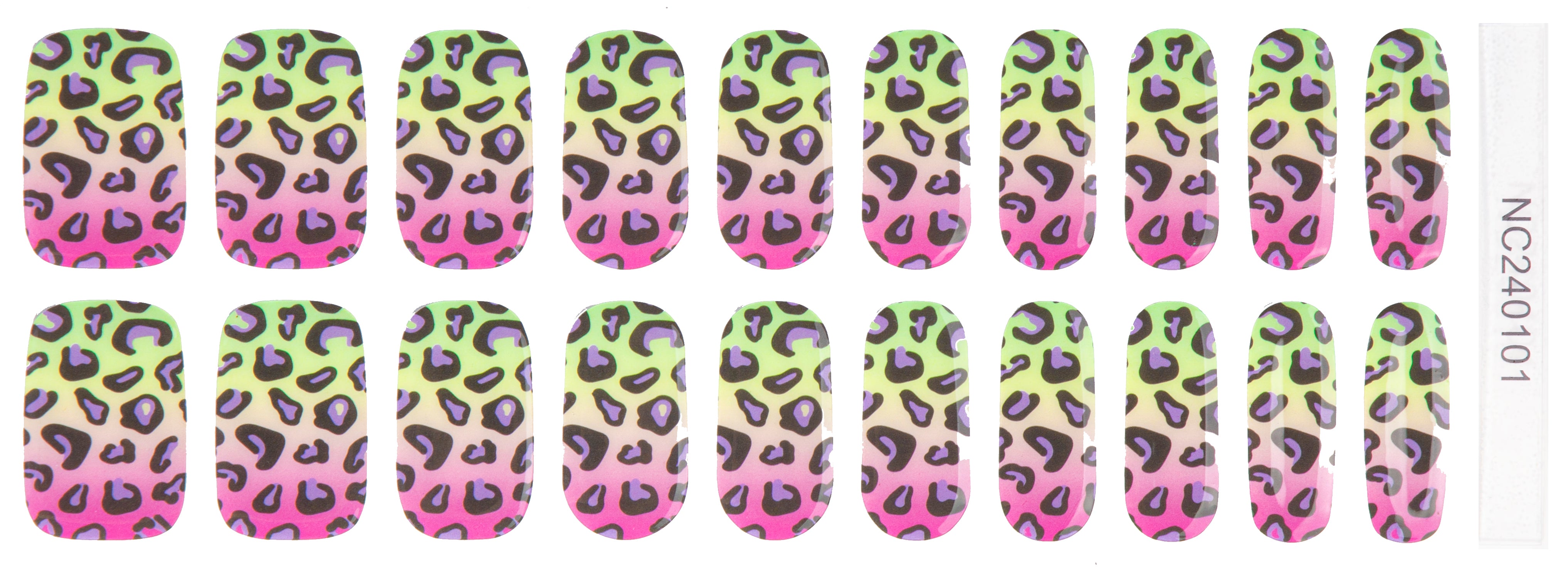 A neon ombré mix of green, yellow, and pink topped with bold black leopard spots — fun, fierce, and eye-catching.