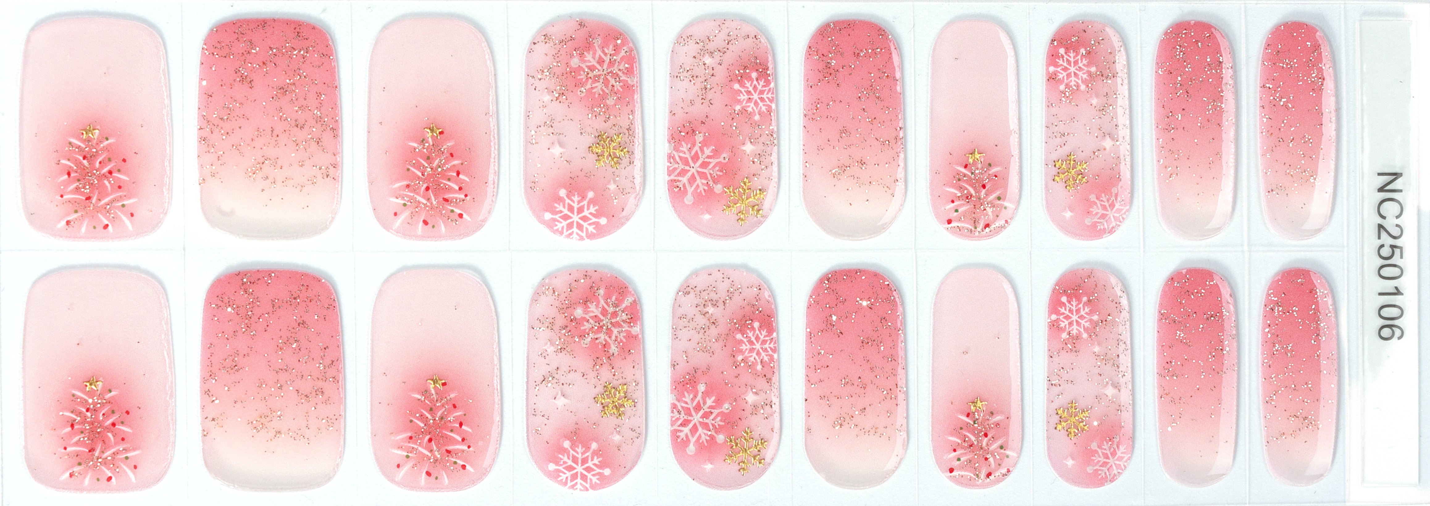 Glittered snowfall cascades over a pink winter gradient, complete with adorable snowflake and tree accents. A fairytale-like holiday manicure.