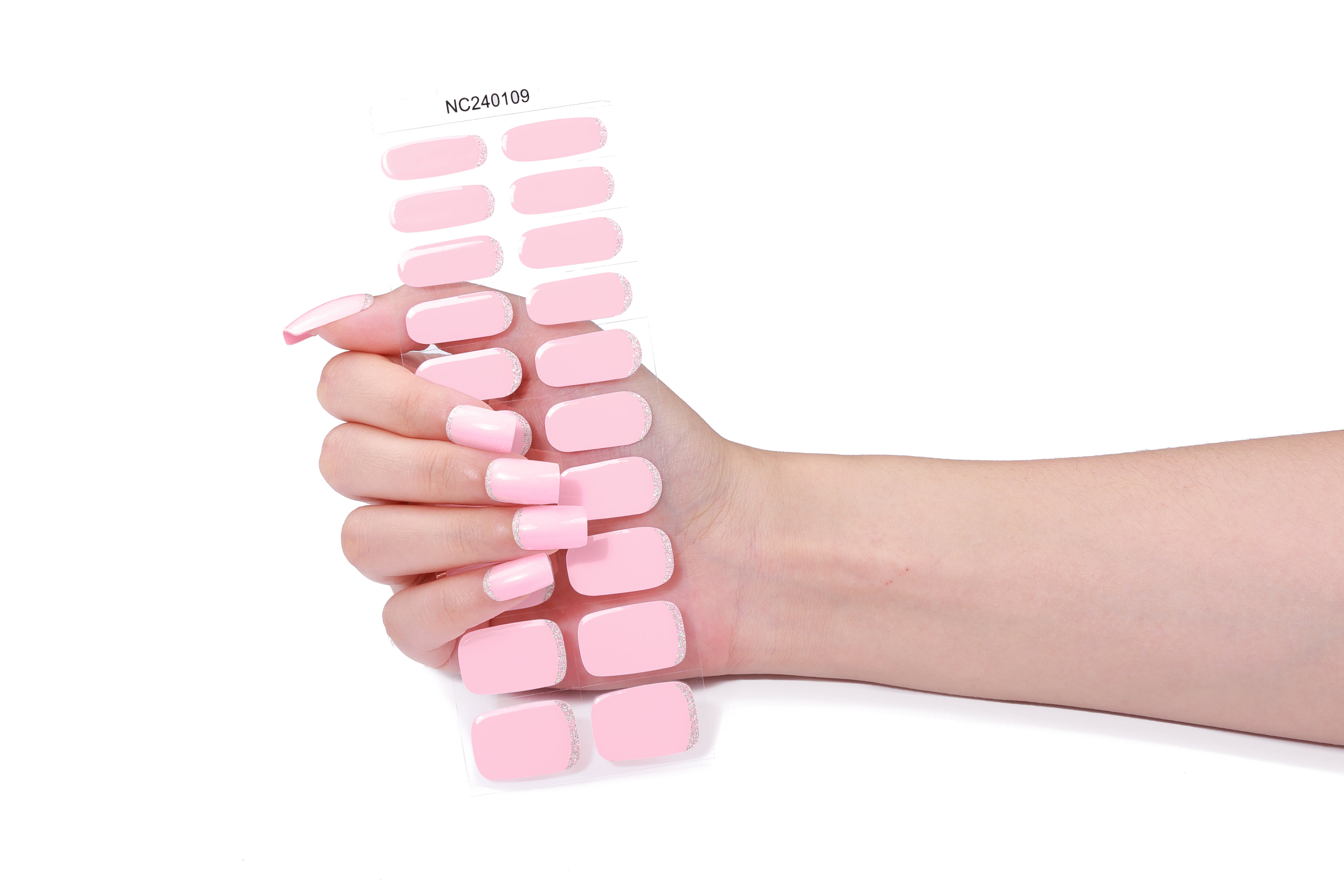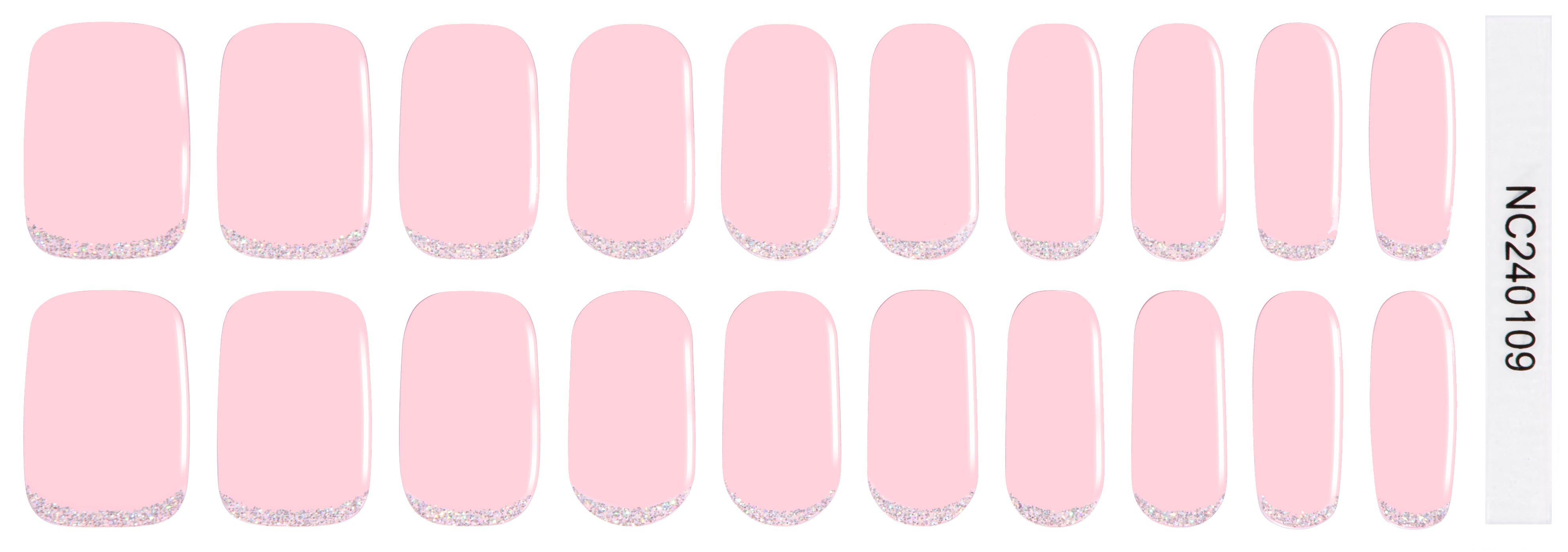 A soft, dreamy baby-pink shade that gives your nails a sweet and feminine glow. The design features a delicate glitter-dipped tip, adding a touch of sparkle without overpowering the gentle pastel base.