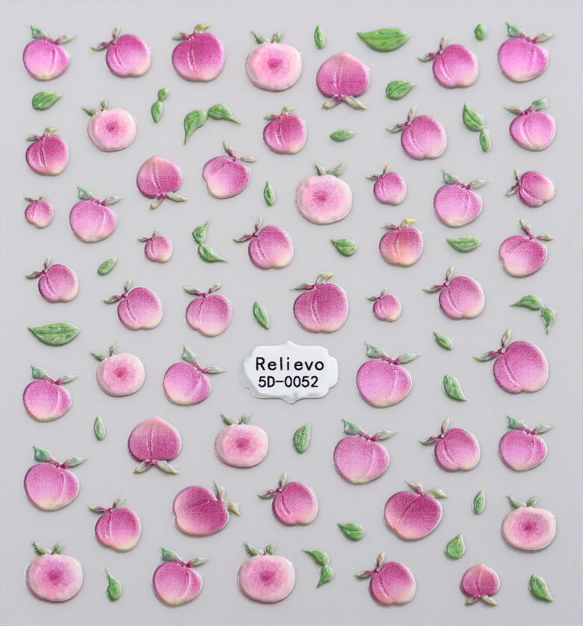 Miniature peaches with soft edges and bright green leaves for a youthful, fresh nail style.