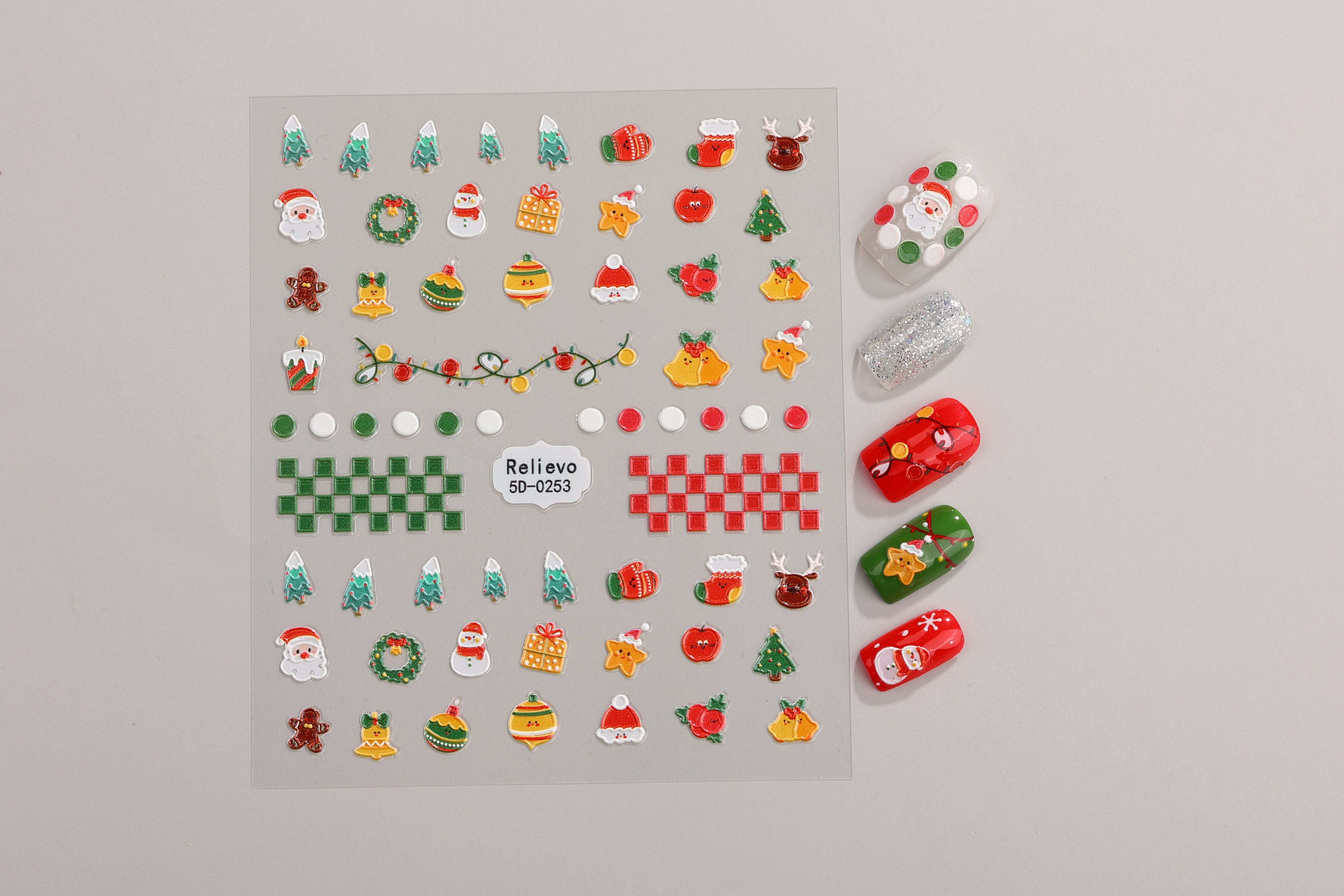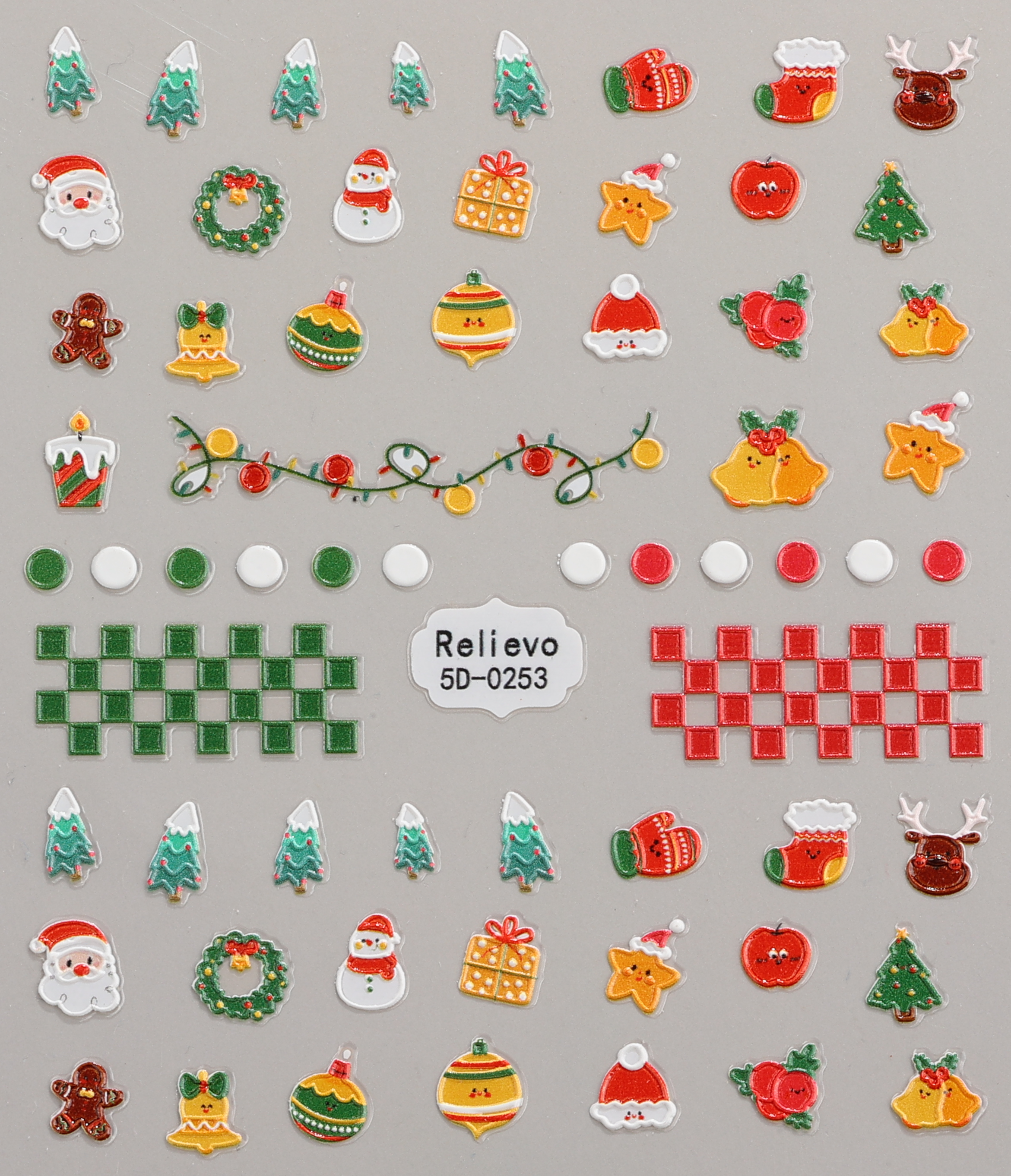 Bright, candy-colored holiday icons including stars, bells, cute Santas, tiny wreaths, mittens, apples, ornaments, and reindeer. Finished with glossy 5D dimension and paired with checkered strips in red and green to create sweet, cheerful Christmas designs.